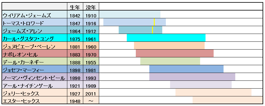 ちなみに、アメリカで花開いた「成功と繁栄の哲学」の源流とみなされているイギリスの思想家ジェームズ・アレンやトーマス・トロワード、および「成功と繁栄の哲学」に関わる書物を著したナポレオン・ヒル、デール・カーネギー、ジョセフ・マーフィー博士等々のアメリカの自己啓発作家などの生没年を表形式で示せば次のとおりです。